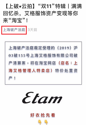今年双11,上海破产法庭公众号发布的一则“双11特辑”消息,更是以“全场一折”的跳楼价处理艾格的剩余资产。