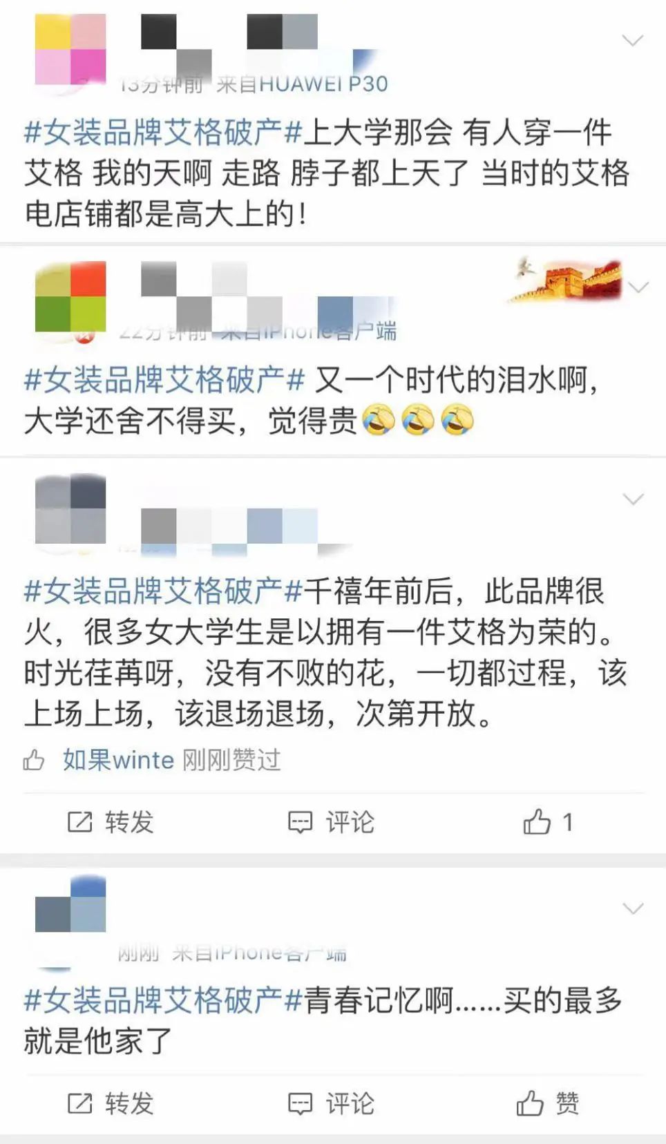有网友回忆说,学生时代穿艾格实在是一件倍有面子的事情,很多女大学生以有一件艾格的衣服为荣,但时光荏苒,辉煌不再,跟不上时代的事物终将被淘汰。