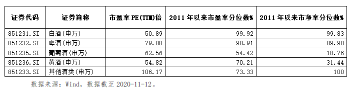 如果从申万三级行业指数的估值看,目前白酒整体的估值在2011年初至今十年的估值高位区间,想要短期继续提升估值,难度是比较大的。