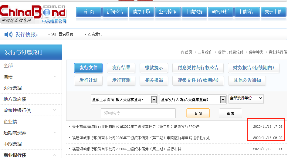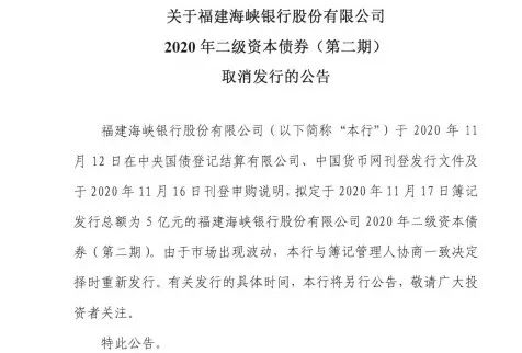 随后,11月16日,中小银行之一福建海峡银行公告,取消应于17日发行的5亿元二级资本债。