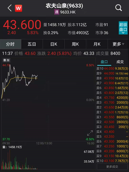 截至上午11点30分,农夫山泉股价报43.60港元,市值4900多亿,成交额超6亿。