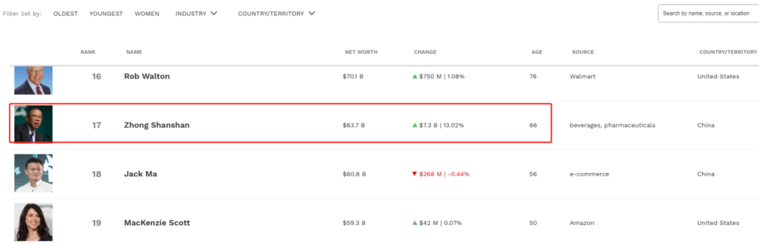 根据福布斯实时富豪榜显示,钟睒睒两日身家净增71亿美元,个人身家达到637亿美元,一举超越马云、马化腾,成中国首富,全球富豪榜排名第17名。
