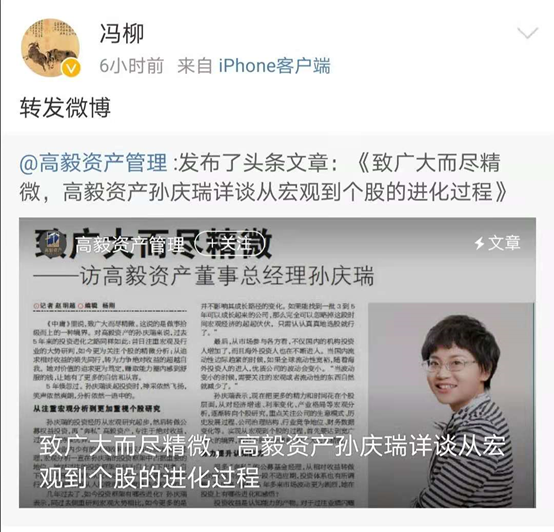 值得注意的是,当日传言发酵后不久,在微博上少有动态的冯柳转发了题为《致广大而尽精微,高毅资产孙庆瑞详谈从宏观到个股的进化过程》的专访,这也被外界视为间接辟谣。