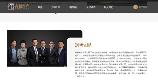 根据其官网的介绍,高毅资产目前投研团队逾40人,投资经理包括千亿级基金公司投资总监、公募股票型基金8年业绩冠军(2007年-2014年)、公募偏股混合型基金6年业绩亚军(2007年-2013年)、公募基金十周年金牛奖特别奖得主、私募基金三年期金牛奖得主、英华奖中国基金业20年最佳基金经理得主等,资深研究员大多数来自于中外大型公募基金管理公司、一线券商研究所和知名资产管理机构,整体投研实力在业内处于领先地位。