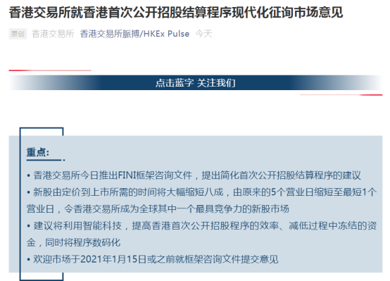11月6日,港交所推出FINI框架咨询文件,提出简化首次公开招股结算程序的建议。据介绍,FINI平台可在新上市公司“敲锣”上市交易前,处理启动招股、认购、定价、配发、付款、监管机构批准及纳入股份等所有必要步骤。