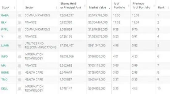 贝莱德(BLK.US)位列第二,持仓约595万股,持仓市值约33.54亿美元。PayPal(PYPL.US)位列第三,持仓约939万股,持仓市值约18.5亿美元,今年三季度新增8334股。Visa(V.US)和CENTURYLINK INC(LUMN.US)分别位列第四和第五,持仓市值分别约10.25亿美元和9.81亿美元。百济神州(BGNE.US)位列第八位,持仓市值约7.59亿美元。