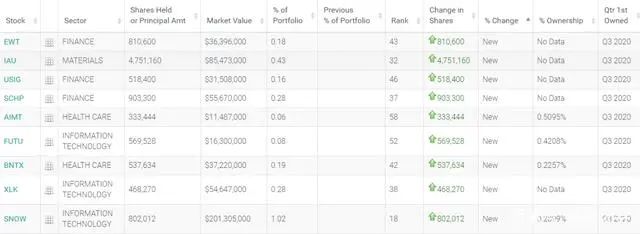此外,淡马锡本季度还对ETF、信息科技、医疗健康等个股建仓。其中,建仓了三支ETF分别为安硕MSCI台湾ETF(EWT.US)、iShares Broad USD Investment Grade Corporate Bond ETF(USIG.US)、嘉信理财美国TIPs ETF(SCHP.US)。信息科技及行业ETF方面建仓富途控股(FUTU.US)、高科技指数ETF-SPDR(XLK.US)、还有备受巴菲特青睐的云计算公司Snowflake(SNOW.US)。医疗健康方面建仓生物制药公司Aimmune Therapeutics Inc.(AIMT.US)、疫苗公司BioNTech SE(BNTX.US)。