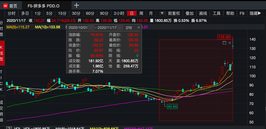 值得一提的是,淡马锡清仓蔚来汽车,而高瓴三季度持仓情况则显示,在三季度内加大对新能源领域的投资,持仓股包括蔚来汽车、理想汽车等。淡马锡是在2018年四季度首次建仓蔚来,2020年二季度才首次建仓拼多多。10月份以来,拼多多股价明显回升,至10月1日至11月17日,区间涨幅达到78%。