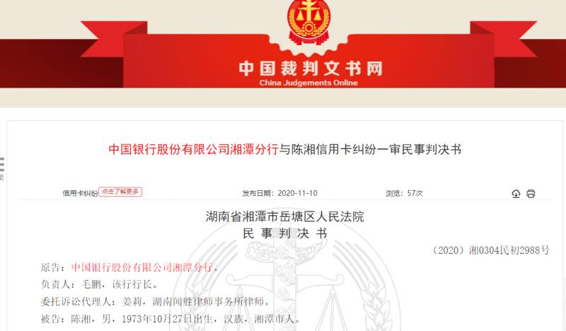 11月10日,中国裁判文书网披露了中国银行股份有限公司湘潭分行(下称“中行湘潭分行”)与陈某信用卡纠纷一审民事判决书((2020)湘0304民初2988号)。