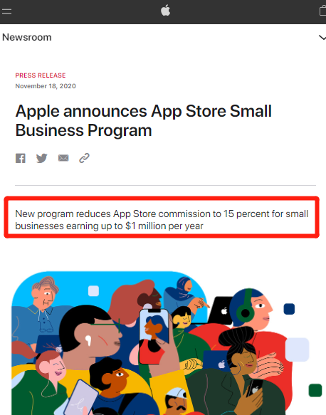 苹果公司与11月18日晚宣布了一项新开发人员计划,年收入不足100万美元的小型企业或独立开发者,有资格参加该计划并获得15%的佣金减免,在苹果App Store应用商店佣金费率从30%降至15%。
