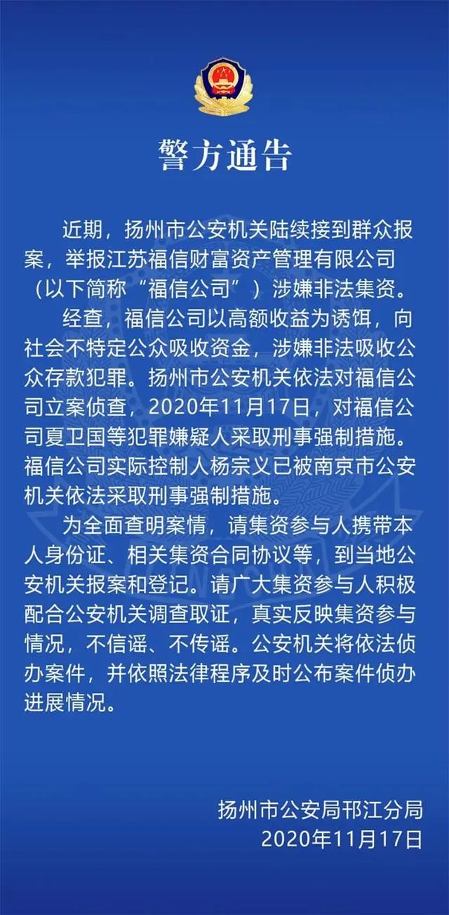 11月17日晚间,扬州市公安局邗江分局通告称,江苏福信财富资产管理有限公司(以下简称福信公司)以高额收益为诱饵,向社会不特定公众吸收资金,涉嫌非法吸收公众存款犯罪。