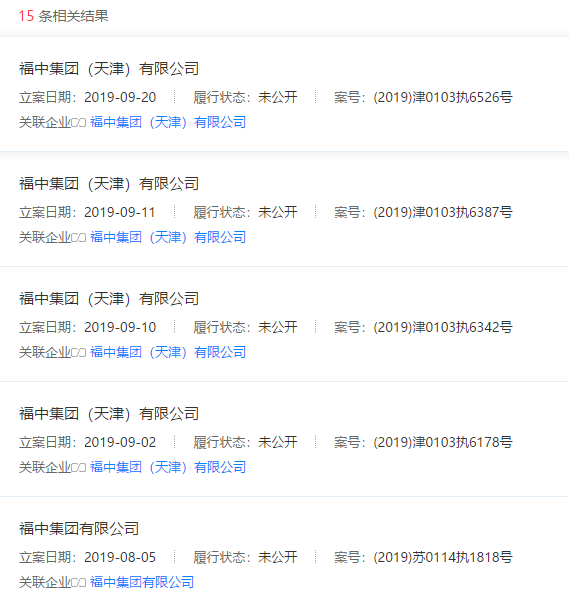 天眼查信息显示,福中集团从2019年8月起,就被南京、天津等多地的地方法院列为失信人。