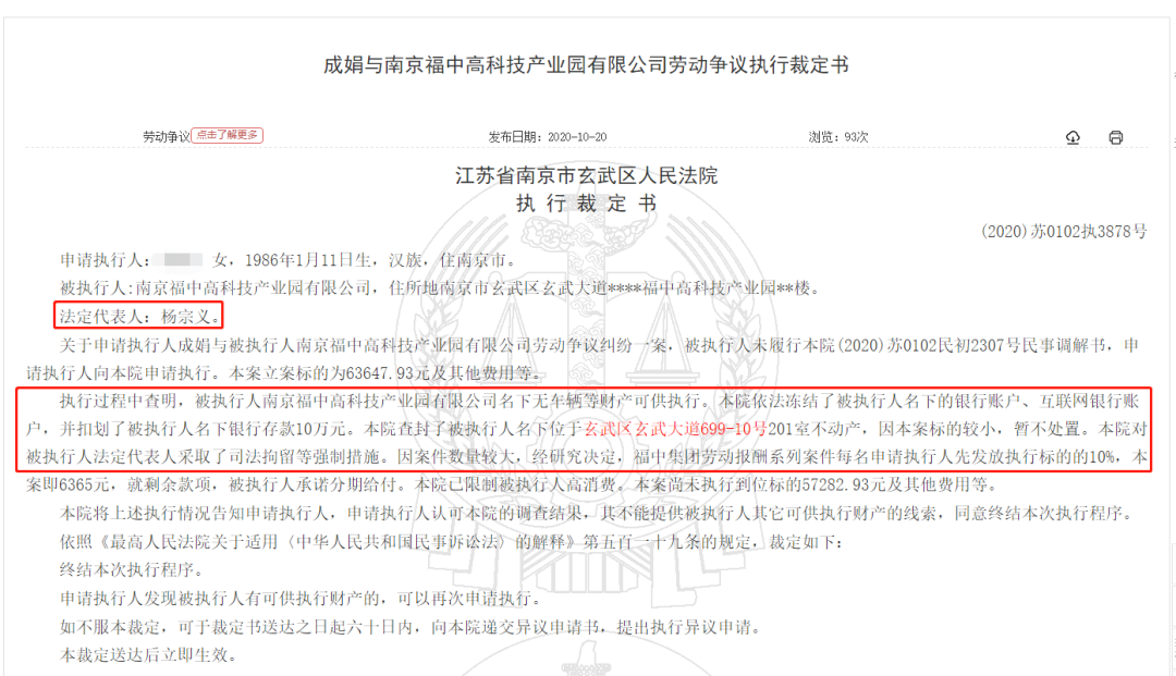 其中一份时间为9月30日的裁定书显示,被执行人南京福中高科技产业园有限公司的法定代表人为杨宗义,该公司名下无车辆等财产可供执行。