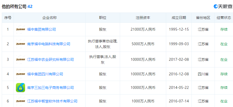 天眼查显示,杨宗义目前名下共有42家公司,且多与“福中”有关,并涉及酒水、电子商务、房地产、医疗科技、物流运输、国际贸易、水产以及文化传媒等诸多领域。