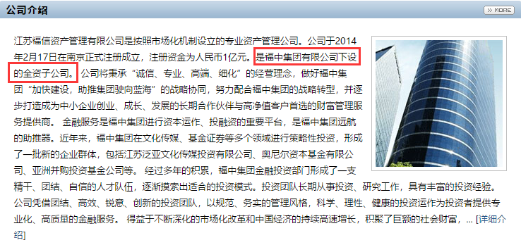 爆雷的福信公司是2014年2月17日在南京正式注册成立,注册资金为人民币1亿元。根据公司介绍,福信公司是福中集团有限公司下设的全资子公司。
