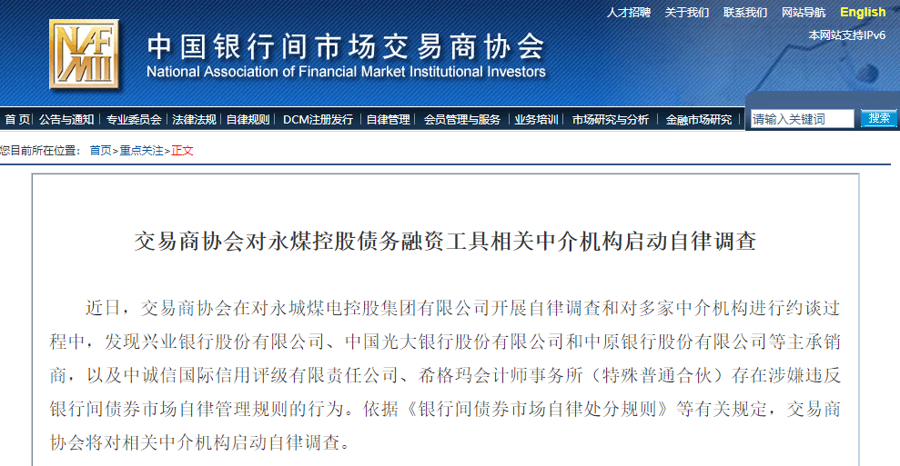 继海通证券之后,11月19日,交易商协会发布公告称,近日,交易商协会在对永城煤电控股集团有限公司开展自律调查和对多家中介机构进行约谈过程中,发现兴业银行股份有限公司、中国光大银行股份有限公司和中原银行股份有限公司等主承销商,以及中诚信国际信用评级有限责任公司、希格玛会计师事务所(特殊普通合伙)存在涉嫌违反银行间债券市场自律管理规则的行为。依据《银行间债券市场自律处分规则》等有关规定,交易商协会将对相关中介机构启动自律调查。