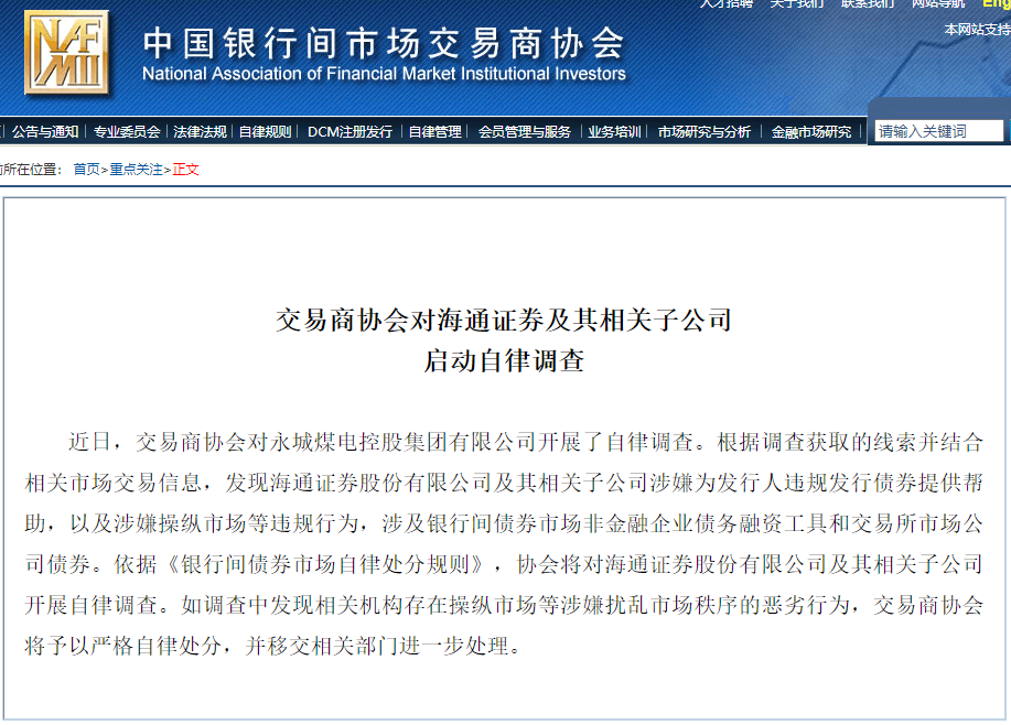 就在11月18日,交易商协会发文称,在对永煤集团开展自律调查时,发现海通证券及其相关子公司涉嫌为发行人违规发行债券提供帮助,以及涉嫌操纵市场等违规行为,涉及银行间债券市场非金融企业债务融资工具和交易所市场公司债券。依据相关规定,交易商协会将对海通证券及其相关子公司开展自律调查。如调查中发现相关机构存在操纵市场等涉嫌扰乱市场秩序的恶劣行为,协会将予以严格自律处分,并移交相关部门进一步处理。