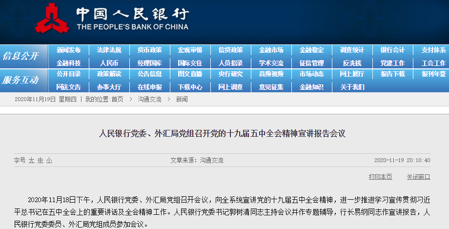 央行19日官网发布消息称,人民银行党委、外汇局党组近日召开会议。人民银行党委书记郭树清表示,建设现代中央银行制度,提升金融服务实体经济水平,扎实推进金融改革,完善现代金融监管体系,完善存款保险制度,推动金融双向开放,加快金融数字化转型。要落实好统筹发展和安全的要求,切实维护金融稳定,坚决守住不发生系统性风险的底线。