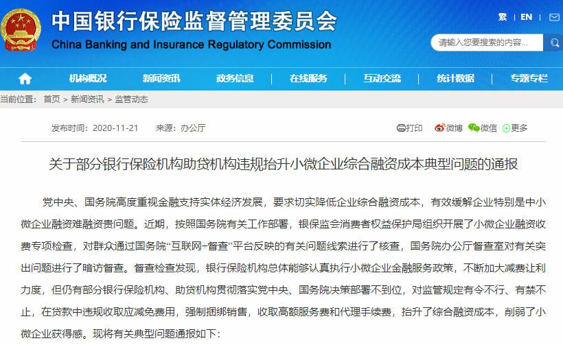 11月21日,国务院办公厅督查室和银保监会办公厅联合通报了在暗访督查中发现的多家金融机构违规向小微企业收取高额服务费,抬升企业综合融资成本的情况。