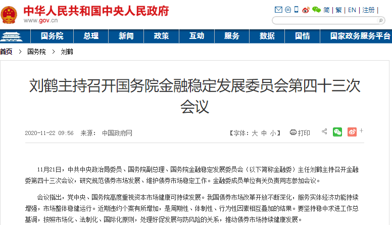 11月21日,中共中央政治局委员、国务院副总理、国务院金融稳定发展委员会(简称金融委)主任刘鹤主持召开金融委第四十三次会议,研究规范债券市场发展、维护债券市场稳定工作。金融委成员单位有关负责同志参加会议。