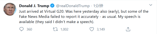 特朗普称,“刚刚抵达20国集团视频会议现场,昨天也是(很早)就到达现场,但一些假新闻媒体像往常一样,没有准确报道此事,我的演讲就在那里,(他们却说我没有演讲)。”