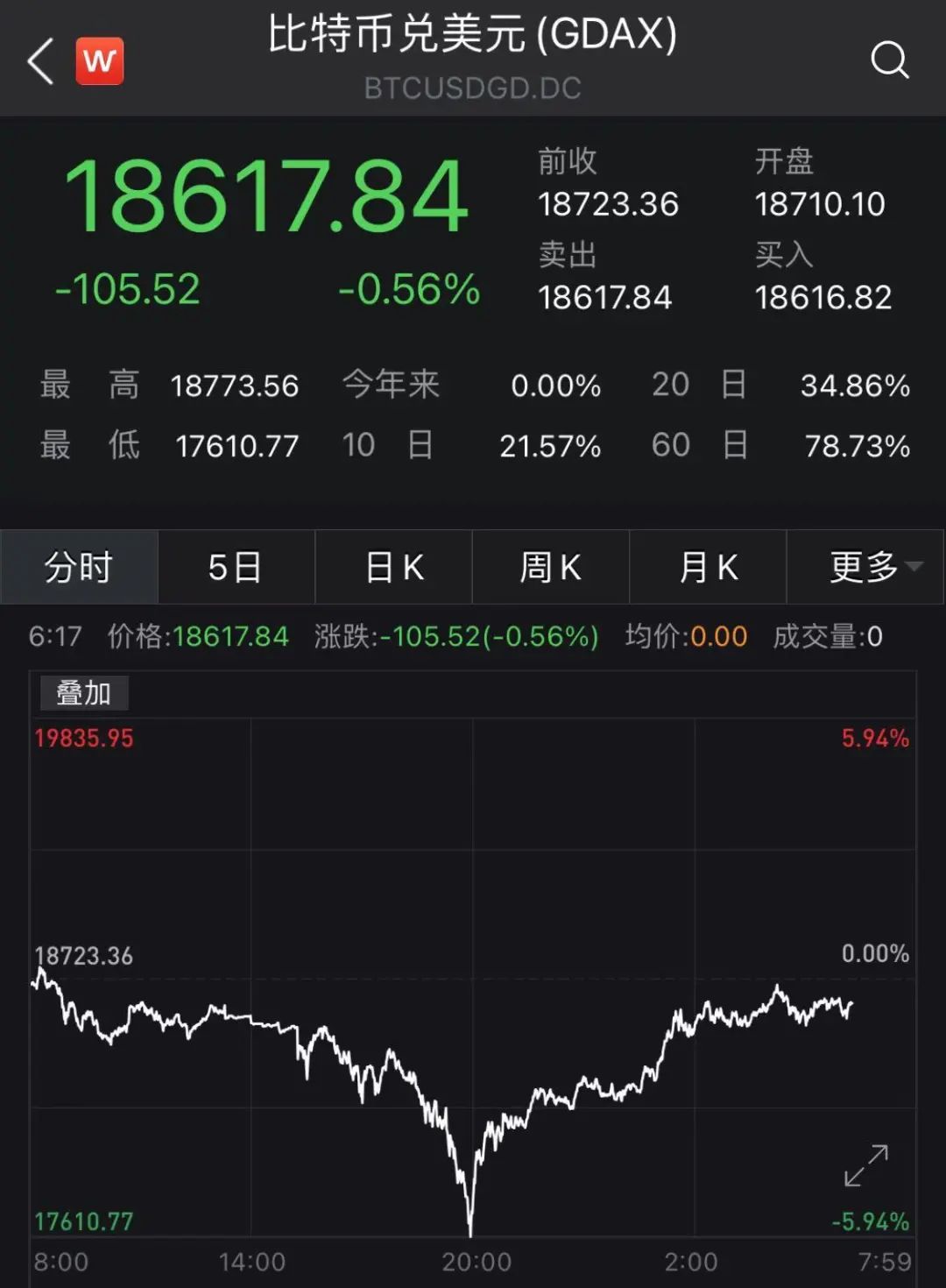 昨日晚,比特币开启了较大幅度的回调,日内一度下跌1000美元,最低曾触及17610美元/枚。