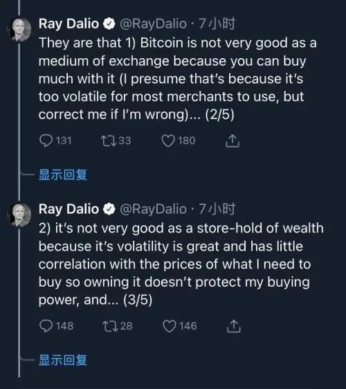 达里奥认为,比特币不是很好的交换媒介,比特币波动幅太大,因而很难用来购买大多数商品。而且,比特币并不是很好的财富存储工具,因为比特币波动幅度太强且与我们需要购买的东西的价格没有太大的相关性,所以拥有比特币并不能保护购买力。