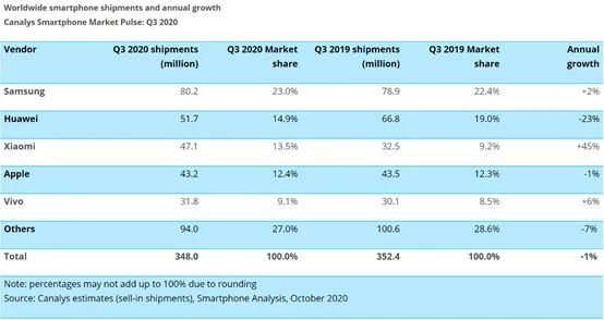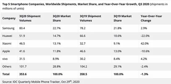三大研究机构IDC、Canalys、Counterpoint的统计报告均显示,今年第三季度小米出货量超越苹果跃居第三,其增长势头也在头部厂商中最为显眼。以IDC数据为例,小米第三季度出货量同比增长42%至4650万部,市场占有率为13.1%;三星继续以22.7%的市场占有率排名第一,但其2.9%的增长速度略显乏力;华为以14.7%的市场占有率位居第二,但出货量同比下滑22%至5190万部;苹果出货量则同比下滑10.6%,退居至第四位。