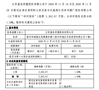 11月23日晚间,洋河股份发布公告,江苏蓝色同盟股份有限公司于2020年11月18日至11月20日通过大宗交易方式减持洋河股份股票2262.67万股,占洋河股份总股本的1.50%。查询大宗交易数据,11月18日到11月20日,洋河股份这三天的大宗交易股份数刚好是2262.67万股,正是蓝色同盟减持的股份数,交易金额合计为37.55亿元。