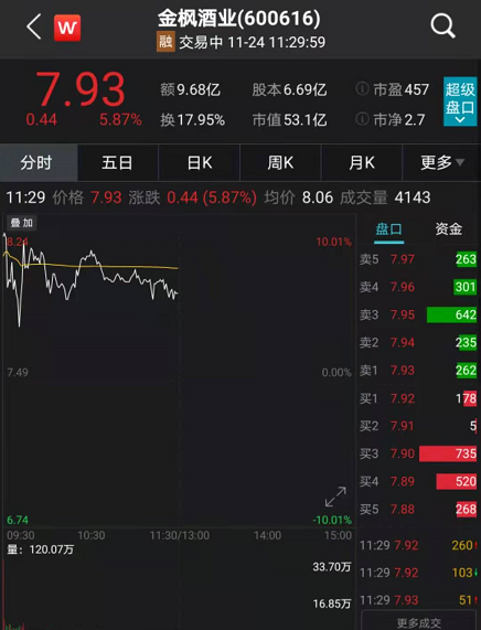 11月24日早盘,金枫酒业再度高开,期间一度冲击涨停板。而这也是该股连续四个交易日刷出涨停板位置。截至午盘,金枫酒业涨超5%以上。