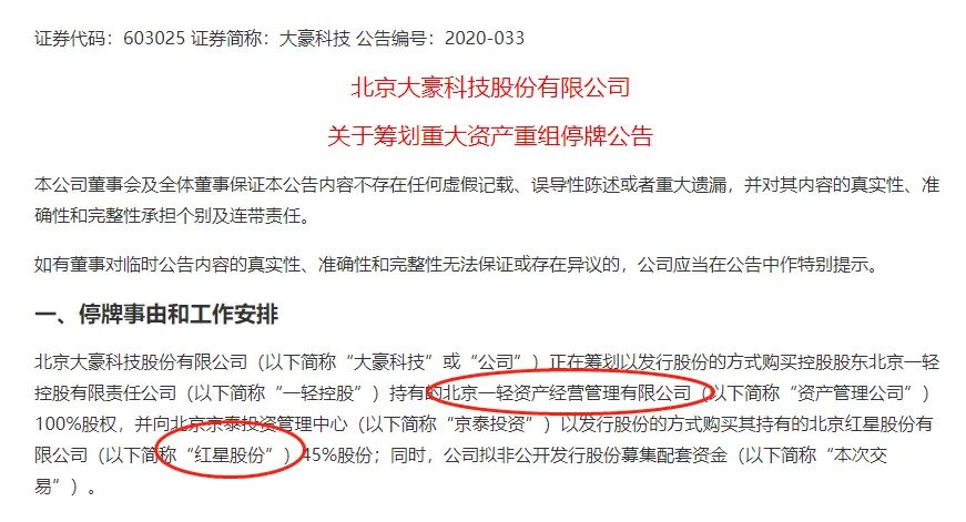 11月24日晚间,已经停牌一天的A股公司大豪科技发布公告,公司拟发行股份购买控股股东一轻控股持有的资产管理公司100%股权和京泰投资持有的红星股份45%股份,公司同时拟募集配套资金。