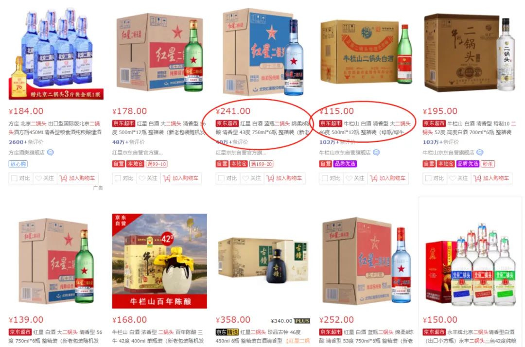在某电商平台搜索二锅头,出来的主要也是红星和牛栏山,从价格来看,红星二锅头高于牛栏山二锅头。