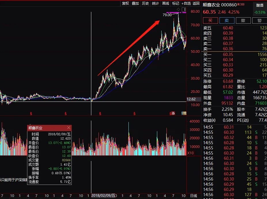 以牛栏山二锅头白酒为主要资产的顺鑫农业,最新市值为448亿元,并且从2018年2月股价底部,到2020年8月底高位,2年半时间顺鑫农业股价暴涨超5倍,也是最近几年的大牛股。