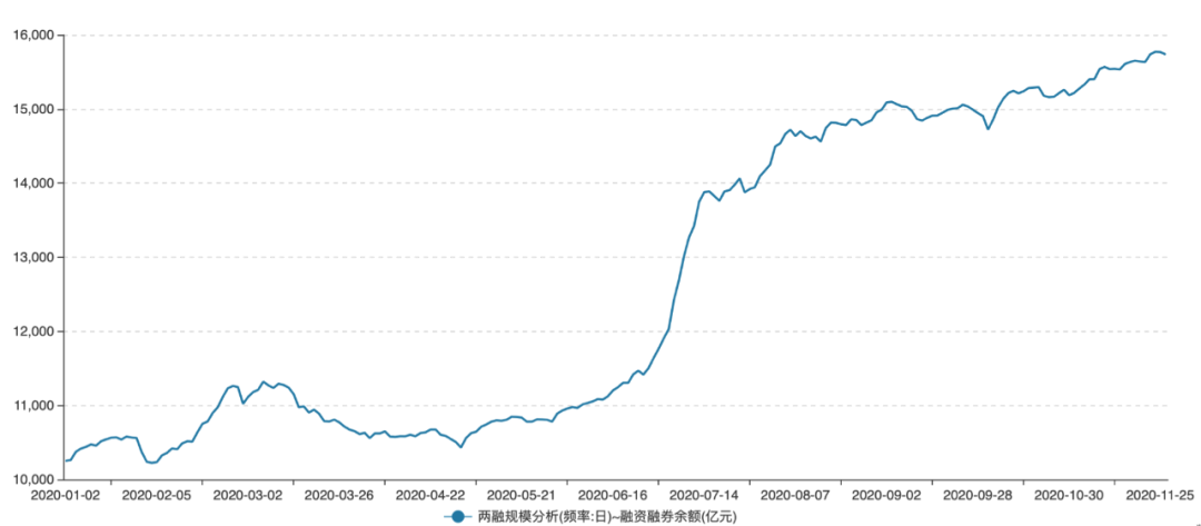 11月26日,沪深两市两融余额为15736.97亿元(年内高点为11月24日的15770.90亿元),连续34个交易日保持在1.5万亿关口之上。对比历史数据,这一数字几乎与2015年7月牛市末期相当,创下了近五年的新高。