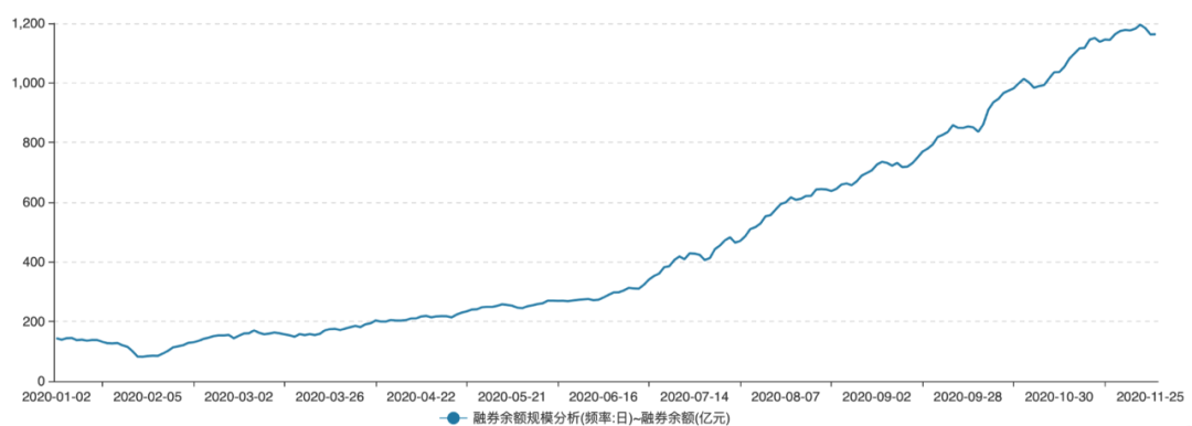 从融券余额的变化曲线来看,6月是其加速增长的起点。Wind数据显示,整个下半年,全市场融券余额从341.16亿元,大幅增长至11月26日的1163.35亿元,近半年时间里累计增幅达到了241%。