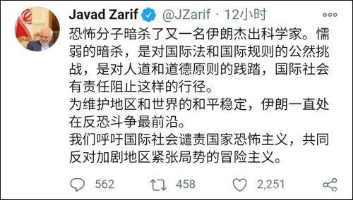 这次的暗杀事件发生后,伊朗外长扎里夫在推特上用英文、阿拉伯文、中文、俄文四种语言发推称:恐怖分子暗杀了又一名伊朗杰出科学家。懦弱的暗杀,是对国际法和国际规则的公然挑战,是对人道和道德原则的践踏,国际社会有责任阻止这样的行径。为维护地区和世界的和平稳定,伊朗一直处在反恐斗争最前沿。我们呼吁国际社会谴责国家恐怖主义,共同反对加剧地区紧张局势的冒险主义。
