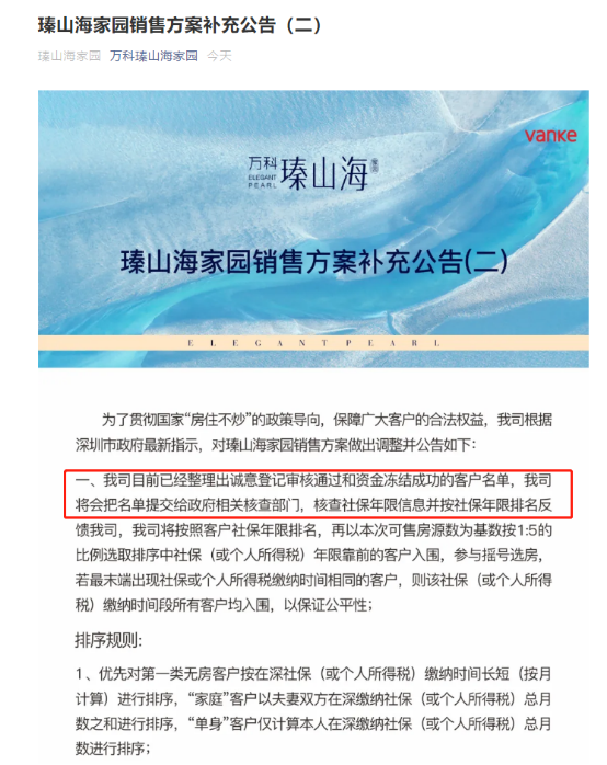 12月1日,万科臻山海家园发布消息,为了贯彻国家“房住不炒”的政策导向,保障广大客户合法权益,万科根据深圳市政府最新指示,对瑧山海家园销售方案做出调整,整理的诚意客户名单将提交给政府相关核查部门,核查社保年限信息等。