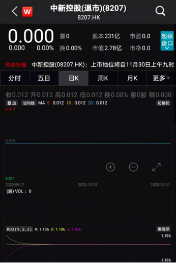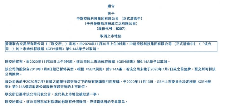 据港交所公告,从“2020年11月30日上午9时起,中新控股科技集团有限公司(正式清盘中)的上市地位将根据《GEM规则》第9.14A条予以取消”。公告显示,“在2020年11月30日的最后上市日期后,尽管股票仍属有效,但股份将不会于香港联交所挂牌及交易。”