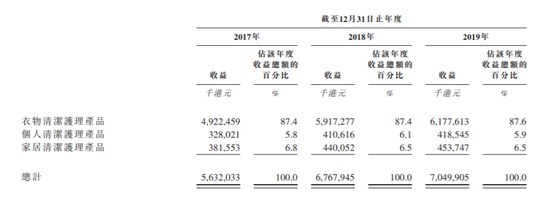 据招股书显示,2017-2019年,蓝月亮分别实现营收56.32亿港元、67.68亿港元、70.5亿港元,复合年增长率为11.9%;对应的净利润为0.86亿港元、5.54亿港元、10.79亿港元,复合年增长率为254%。在天猫“双11”品牌销售额榜单中, 蓝月亮今年“双11”当天销售稳居家清类目销量第二的位置,在家清类目的细分品类里,蓝月亮占据了衣物洗护品类的第一。