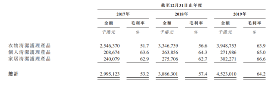公司三大产品毛利率高达65%左右,其中,家居清洁护理产品毛利率高达66.6%,衣物清洁护理产品毛利63.9%。