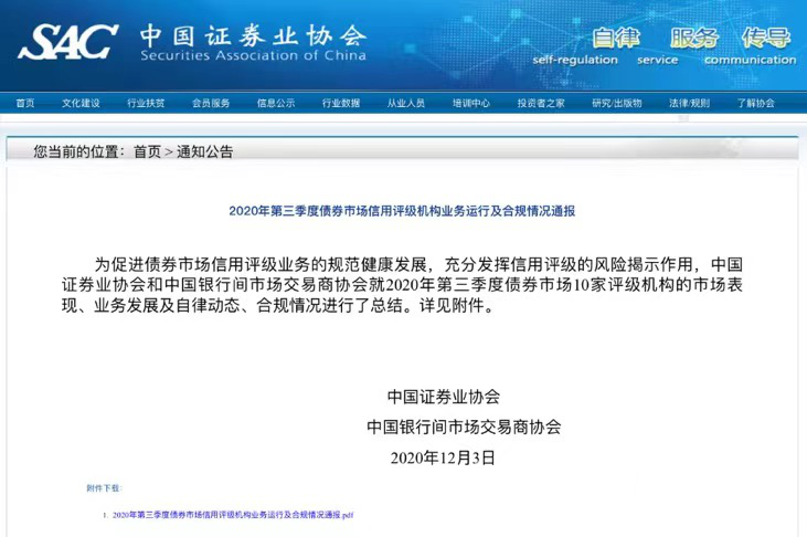 日前,中国证券业协会发布2020年第三季度债券市场信用评级机构业务运行及合规情况通报。