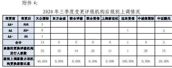 大公国际成为最愿意给发行人好评的企业,三季度,共有136家发行人更换评级机构其中17家发行人的新承做评级机构所给级别高于原级别,占比12.50%,同比提高1.29个百分点。在变更评级机构后级别上调的发行人中,大公国际上调家数最多,有13家。