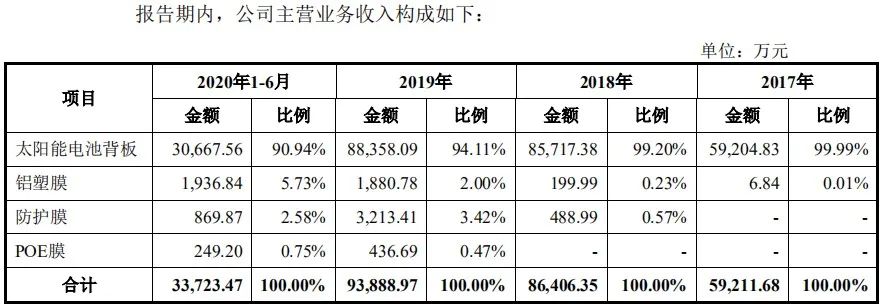 公司是一家主营业务为新型复合膜材料的研发、生产和销售的企业,主要产品是太阳能电池背板,近年来营收比重均超过90%;铝塑膜、特种防护膜、POE胶膜等新开发产品目前还处于起步阶段,营收贡献较低。
