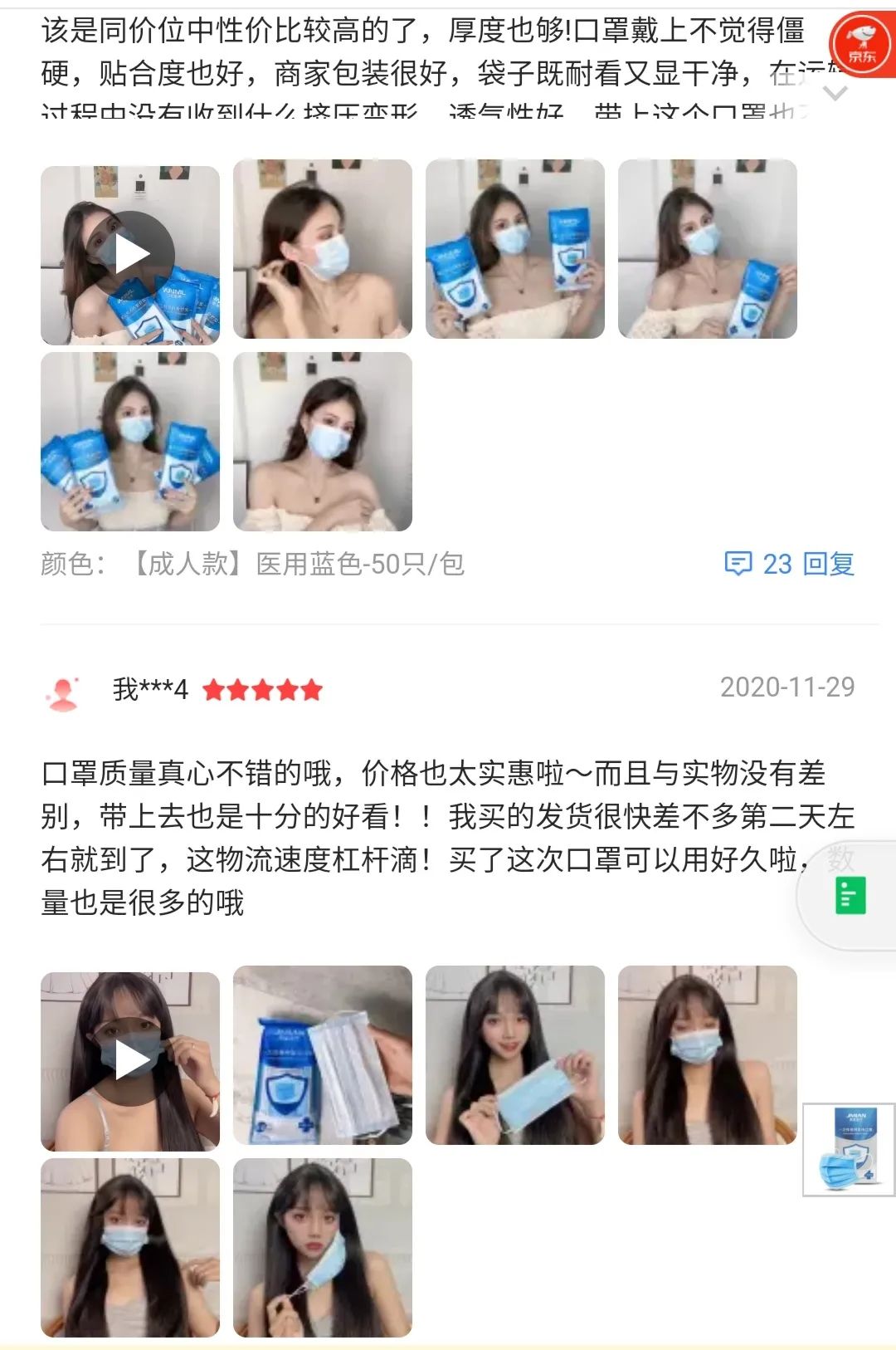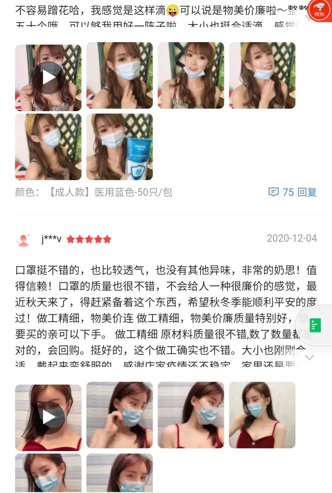 随便摘几条评论,就能感受到这些“美女顾客”对口罩的“高度赞誉”。比如一位网名“j***v”的顾客,先后三天晒自拍的图片和视频给与好评。
