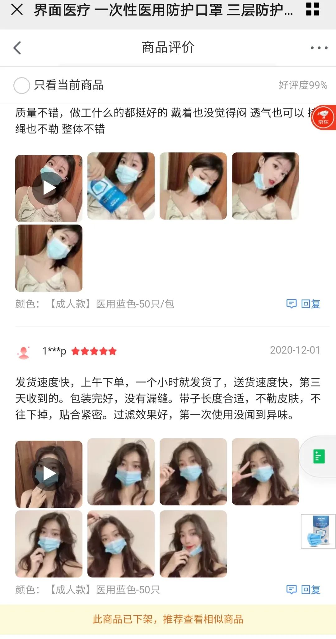 近期国内零星出现的新冠疫情,又让人们想起买口罩。就在昨天(12月9日),某电商平台上的“界面医疗旗舰店”引发广泛关注——并不是因为9.9元/50片的超低价格,而是因为评论区里清一色的美女晒图,甚至有“女顾客”多次晒图评价口罩质量好。