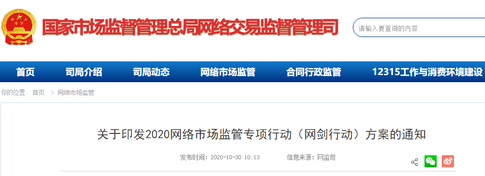 10月30日,国家市场监督管理总局网络交易监督管理司印发《2020网络市场监管专项行动(网剑行动)方案》,网络市场监管部际联席会议各成员单位决定于10-12月联合开展网剑行动,持续推进《电子商务法》贯彻落实,严厉打击网络市场违法行为。