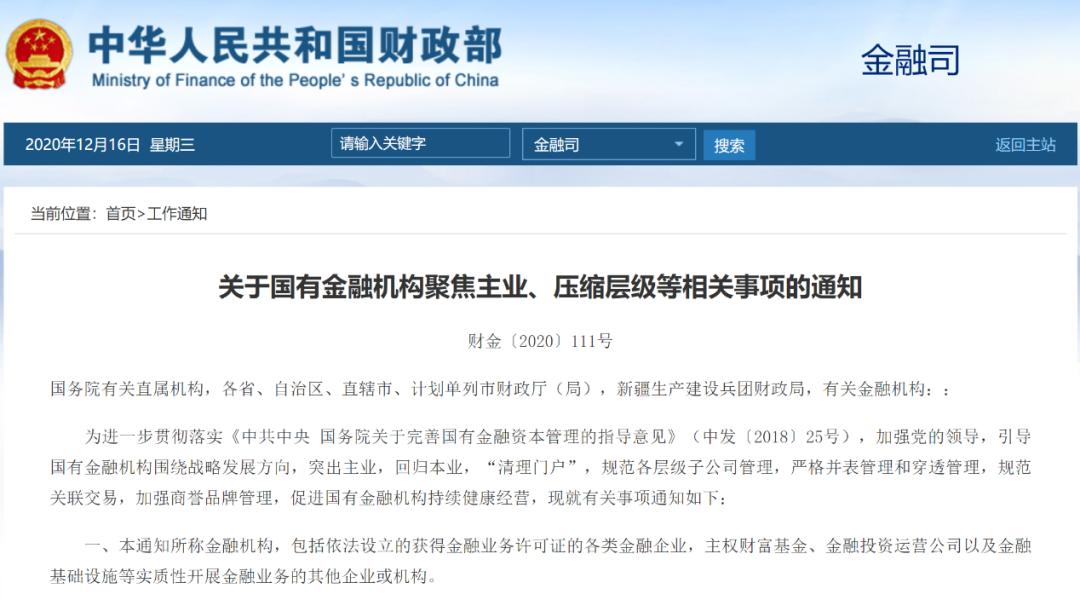 12月16日,财政部发布《关于国有金融机构聚焦主业、压缩层级等相关事项的通知》,引导国有金融机构围绕战略发展方向,突出主业,回归本业,“清理门户”,规范各层级子公司管理,严格并表管理和穿透管理,规范关联交易,加强商誉品牌管理,促进国有金融机构持续健康经营。