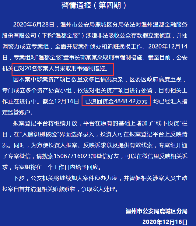 通报表示,目前专案组正加快案件侦办进度,同时加强追赃挽损工作。因本案投资人众多,公安机关为方便投资人报案、登记投资情况、反映诉求、提供有效线索等,即日起正式推出“温都金服”报案登记平台。
