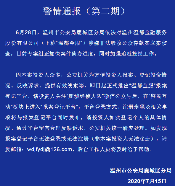 通报称,2020年6月28日,温州市公安局鹿城区分局依法对温州温都金融服务股份有限公司涉嫌非法吸收公众存款罪立案侦查,并将抽调警力成立专案组,全面开展案件侦办和追赃挽损工作。
