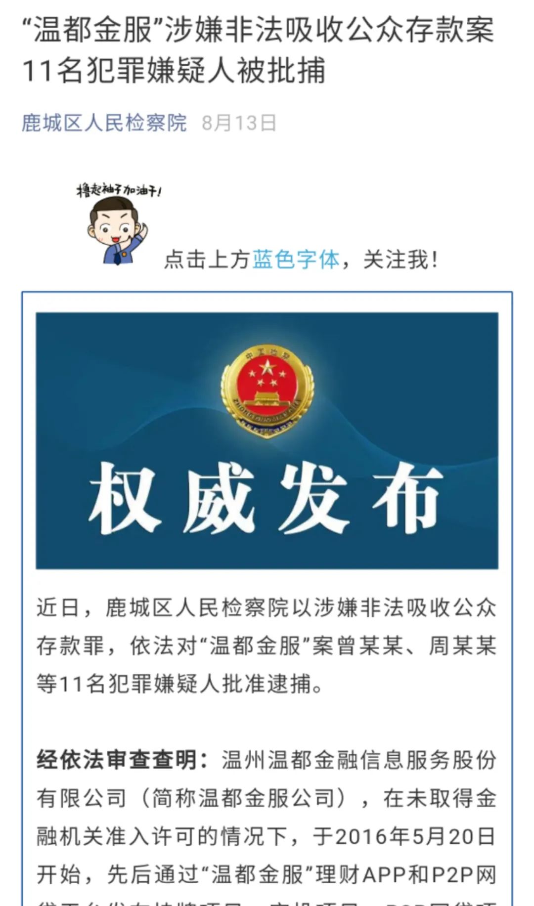 8月13日,“鹿城区人民检察院”微信公众号发布公告称,经依法审查查明,温都金服在未取得金融机关准入许可的情况下,于2016年5月20日开始,先后通过“温都金服”理财APP和P2P网贷平台发布挂牌项目、定投项目、P2P网贷项目等产品标的供投资人投资,承诺还本付息及第三方担保,向社会不特定公众吸收资金,数额巨大,情节严重。